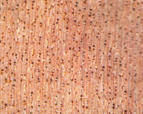 心邊材區(qū)別不明顯。木材淺粉紅褐色至紅褐色。生長輪略可見,不均勻。